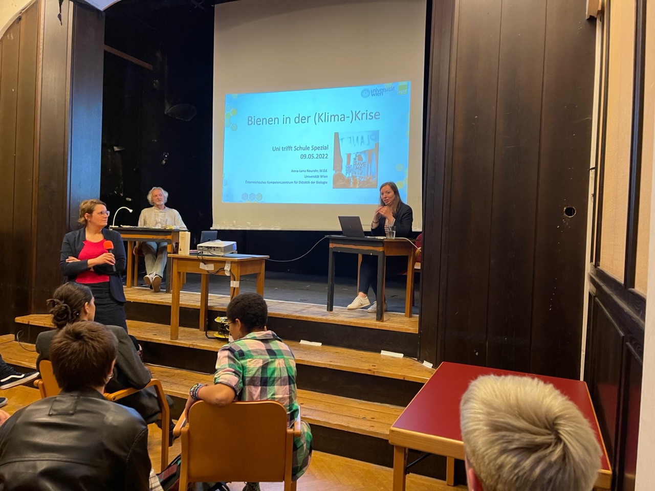 Das AECC Biologie veranstaltet regelmäßig Online-Vorträge von Wissenschaftler*innen für Schüler*innen im Rahmen von „Uni trifft Schule“. Eine ganz besondere Veranstaltung war der Vortrag mit Lesung zum Thema „Bienen in der Klimakrise“. Am 09.05.2022 las der Schauspieler Maximilian Achatz aus dem Buch „Die Geschichte der Bienen“ von Maja Lunde und die Bienendidaktikerin, Anna-Lena Neurohr, M.Ed., berichtete von aktuellen Forschungen rund um die Themen Klimawandel und seine Folgen für die Bienen. Dabei wurden auch auf andere Probleme für die Bienen, die Imkerei (eingeschleppte Parasiten, Toxine) und deren komplexe Rolle für Ökosysteme eingegangen.