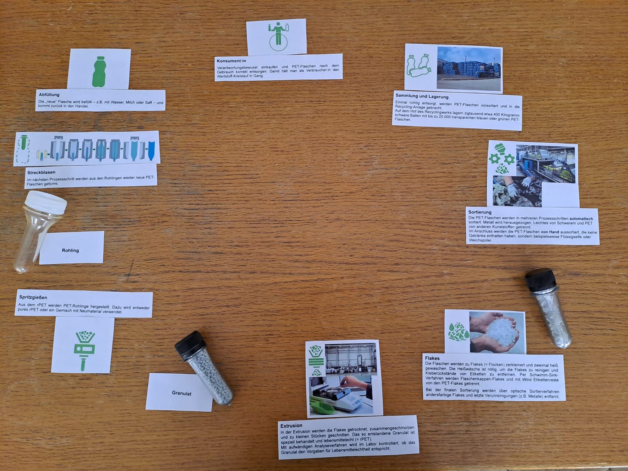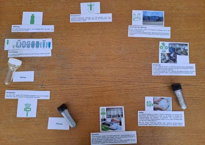 Im Anschluss daran untersuchten sie im Chemieunterricht anhand von Experimenten die Eigenschaften von verschiedenen Kunststoffproben, erstellten Steckbriefe und wiederholten den Kreislaufprozess von Kunststoffen am Beispiel einer PET-Flasche.