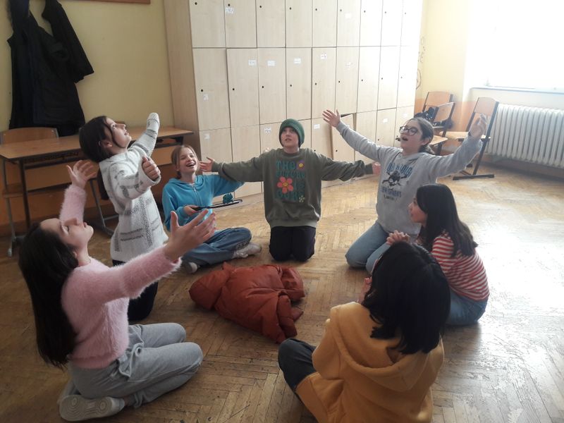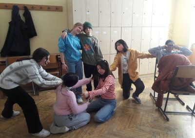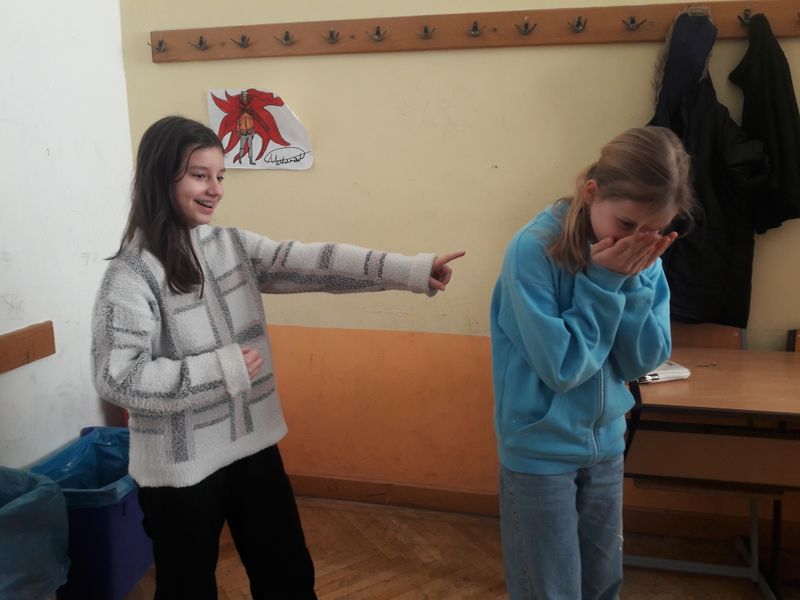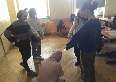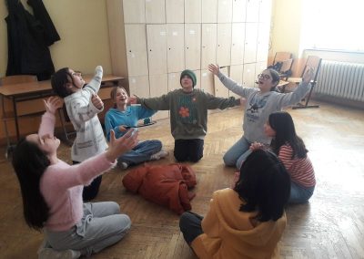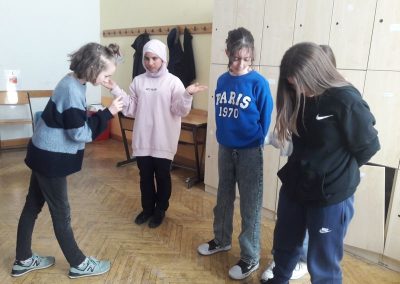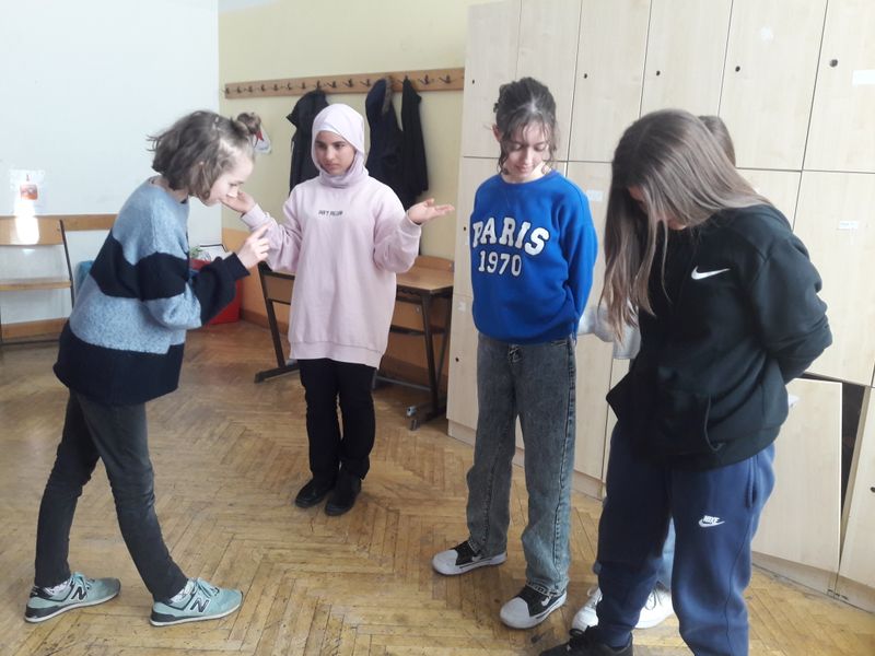 In Kleingruppen (5-6 Schülerinnen) durften sich die Gruppen drei für sie passende Artikel der Menschenrechtskonvention aussuchen. Danach hatten sie mit meiner Unterstützung etwas Zeit, sich Standbilder zu den ausgewählten Artikeln zu überlegen, um diese später den anderen Gruppen zu präsentieren. Zusätzlich zu den Darstellungen konnte die Regisseurin durch Berühren der Standbilder diese auch zum Leben erwecken und so konnten die Figuren uns an ihren Gedanken teilhaben. Optional hatten die Mädchen auch die Wahl, hierfür die englische Sprache anzuwenden.