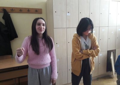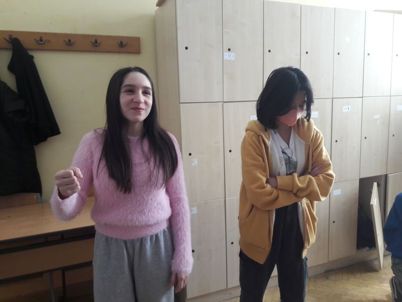 Bezugnehmend zum Projekt „Woche der Menschenrechte“ setzten sich die Mädchen der 2a im Sportunterricht mit dieser Thematik anhand von Standbildern auseinander. Nach einer kurzen Einführung zu den 30 Artikeln der Allgemeinen Erklärung der Menschenrechte ging es auch schon los mit einer Partnerübung. Paarweise hatten sie die Aufgabe, zu einem vorgegebenen Thema wie einem Gefühlszustand oder einem Wort, z.B. Diskriminierung, eine Statue zu bauen. Eine Schülerin hatte die Rolle der „Bildbauerin“ und die andere stellte die Statue dar. Vor jedem Rollentausch gab es auch eine kleine Ausstellung, wo man die Statuen bewundern konnte.