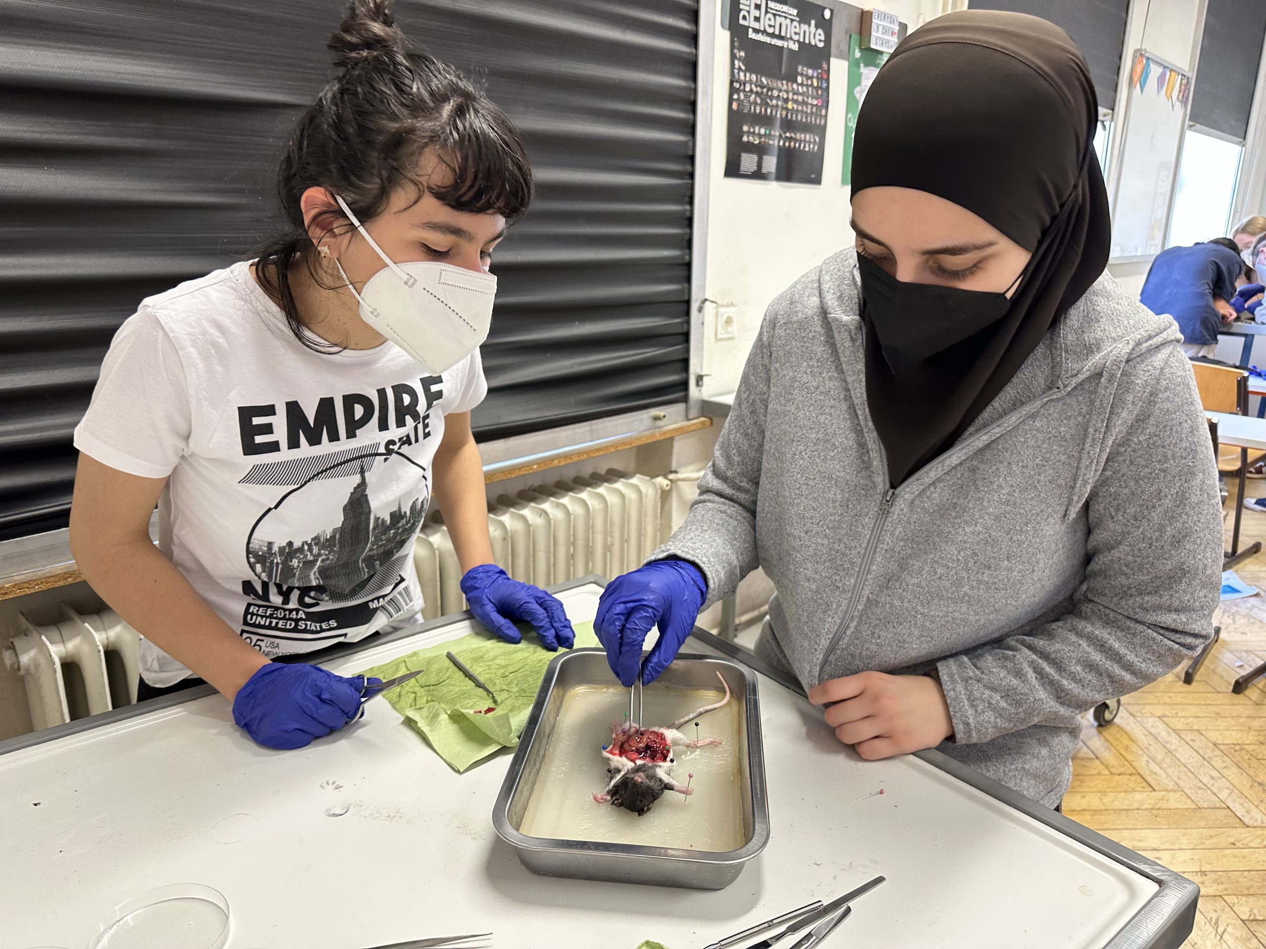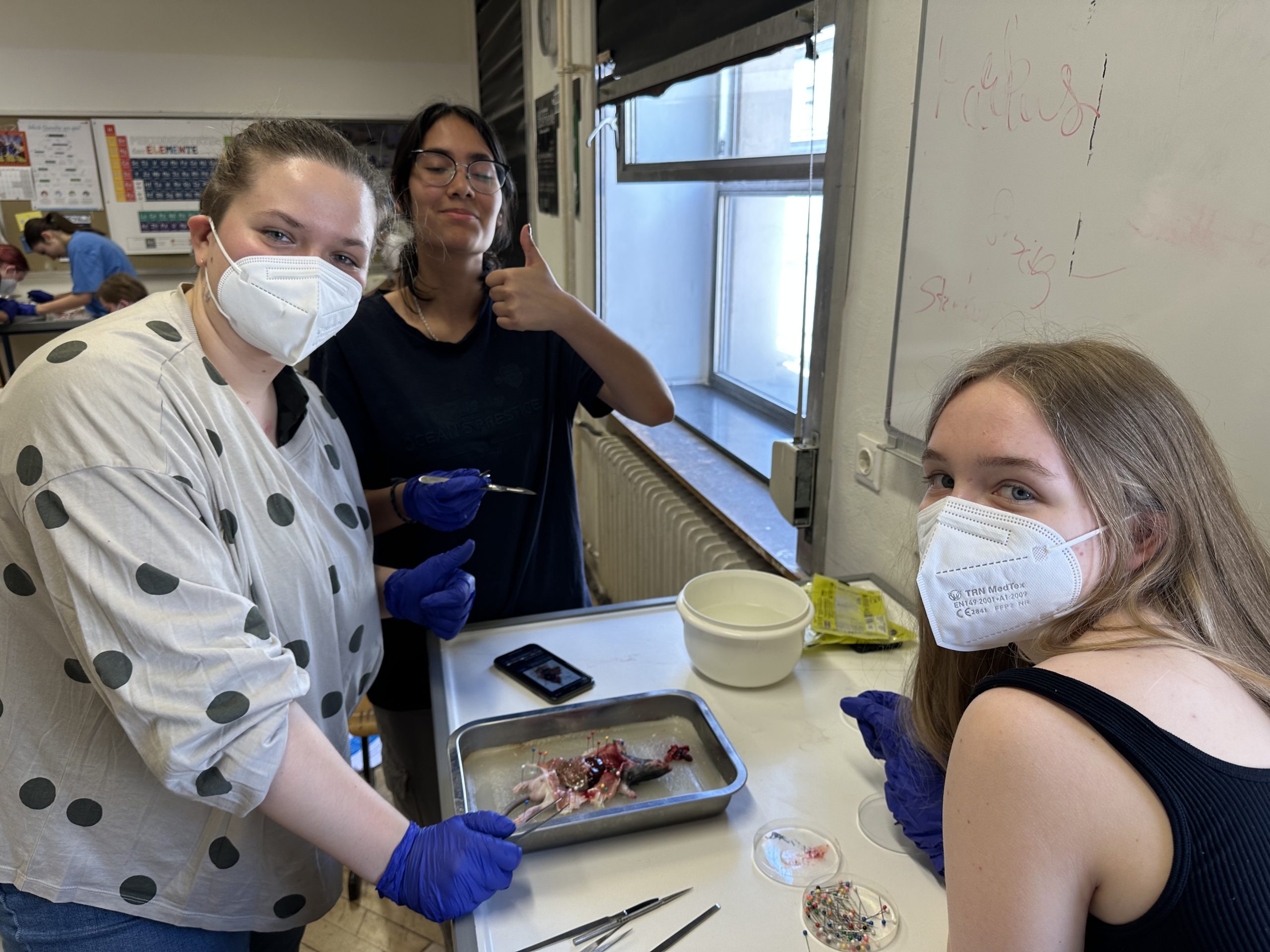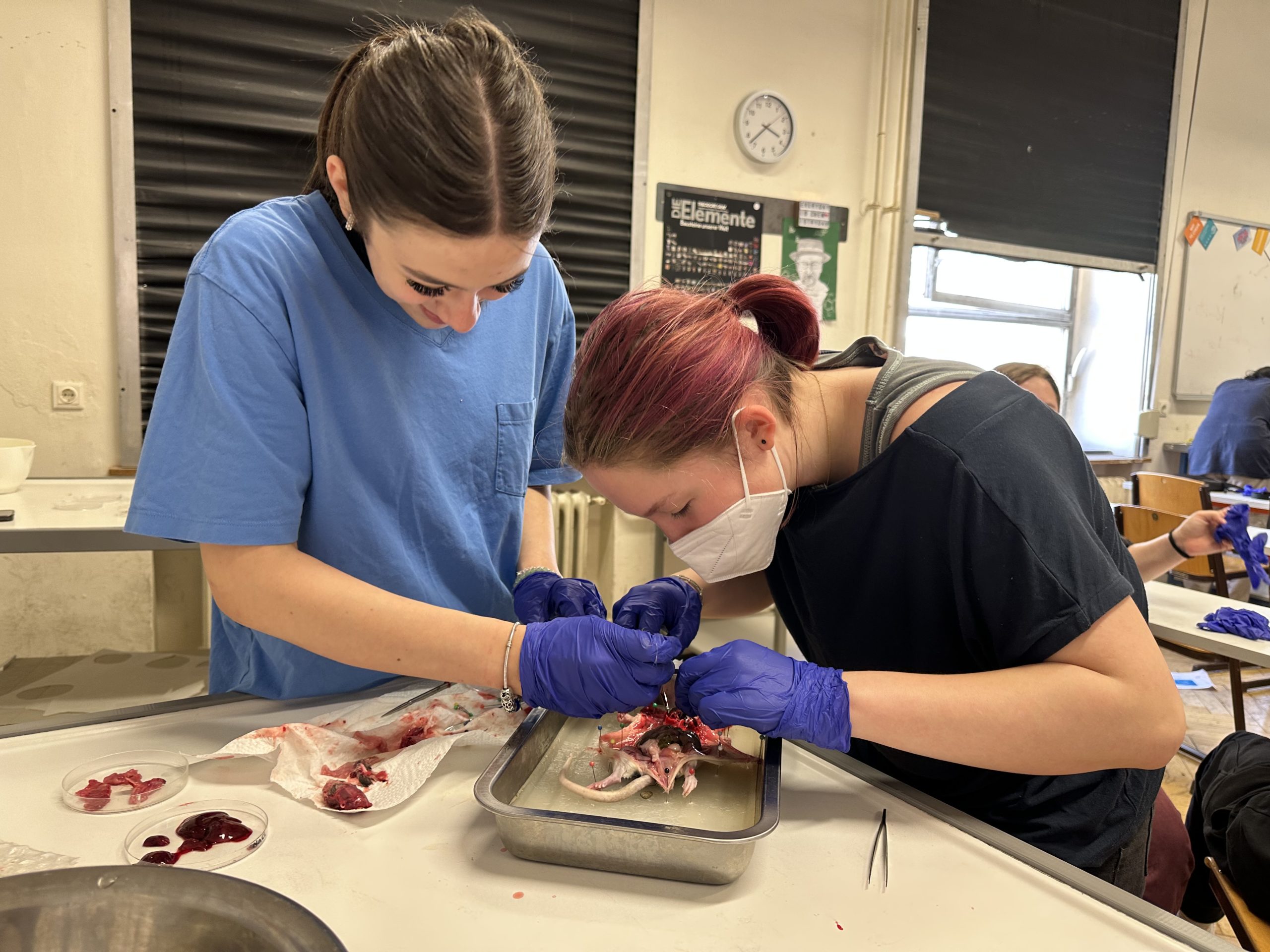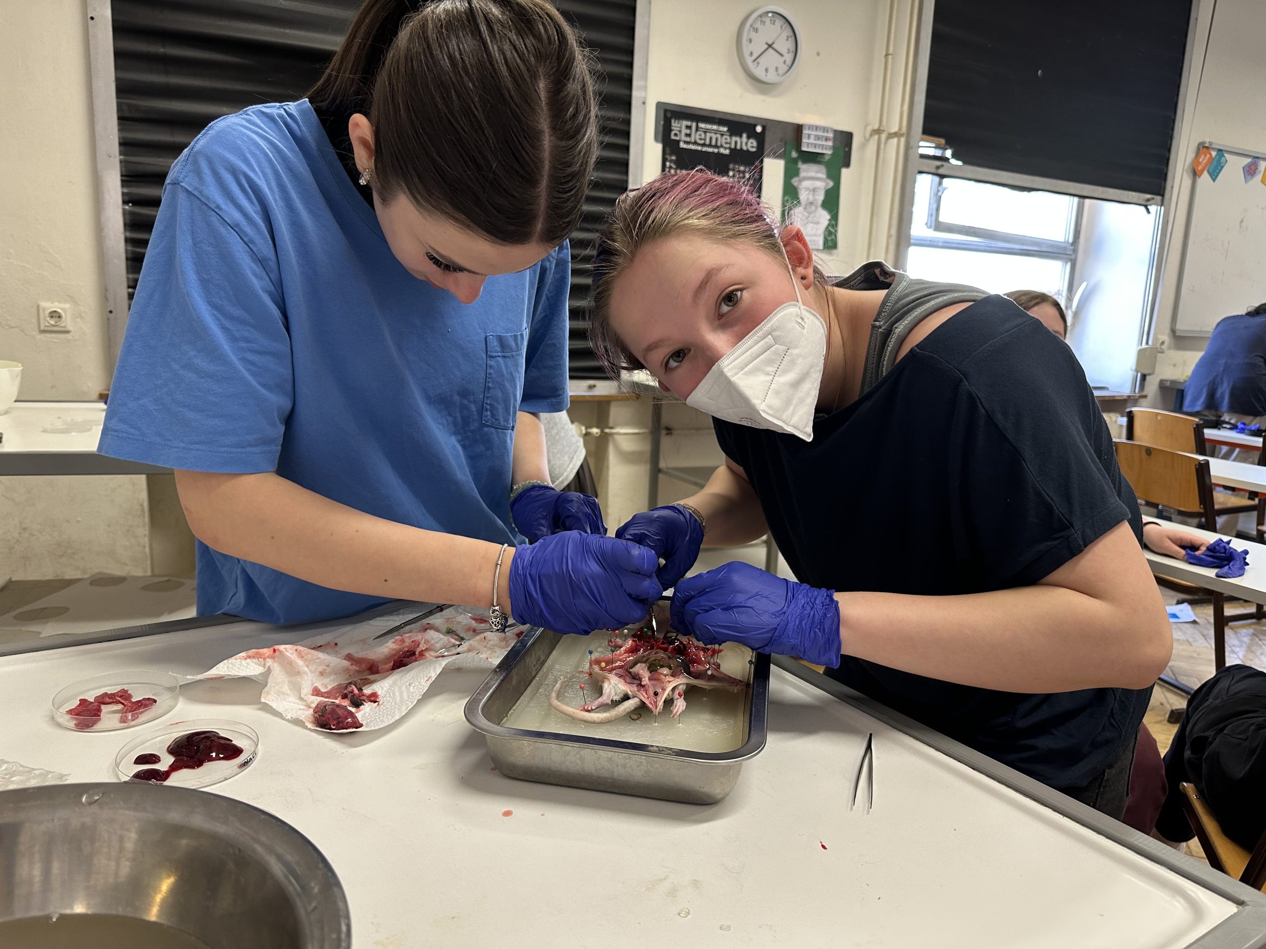 Am 25.05.23 trauen sich die Schüler:innen des WPF Science etwas gang Besonderes: Sie sezieren Ratten. Die Ratten wurden im Zoobedarfsgeschäft gekauft, zur Überbrückung tiefgekühlt und im Wahlpflichtfach nach einer Auftauphase seziert.