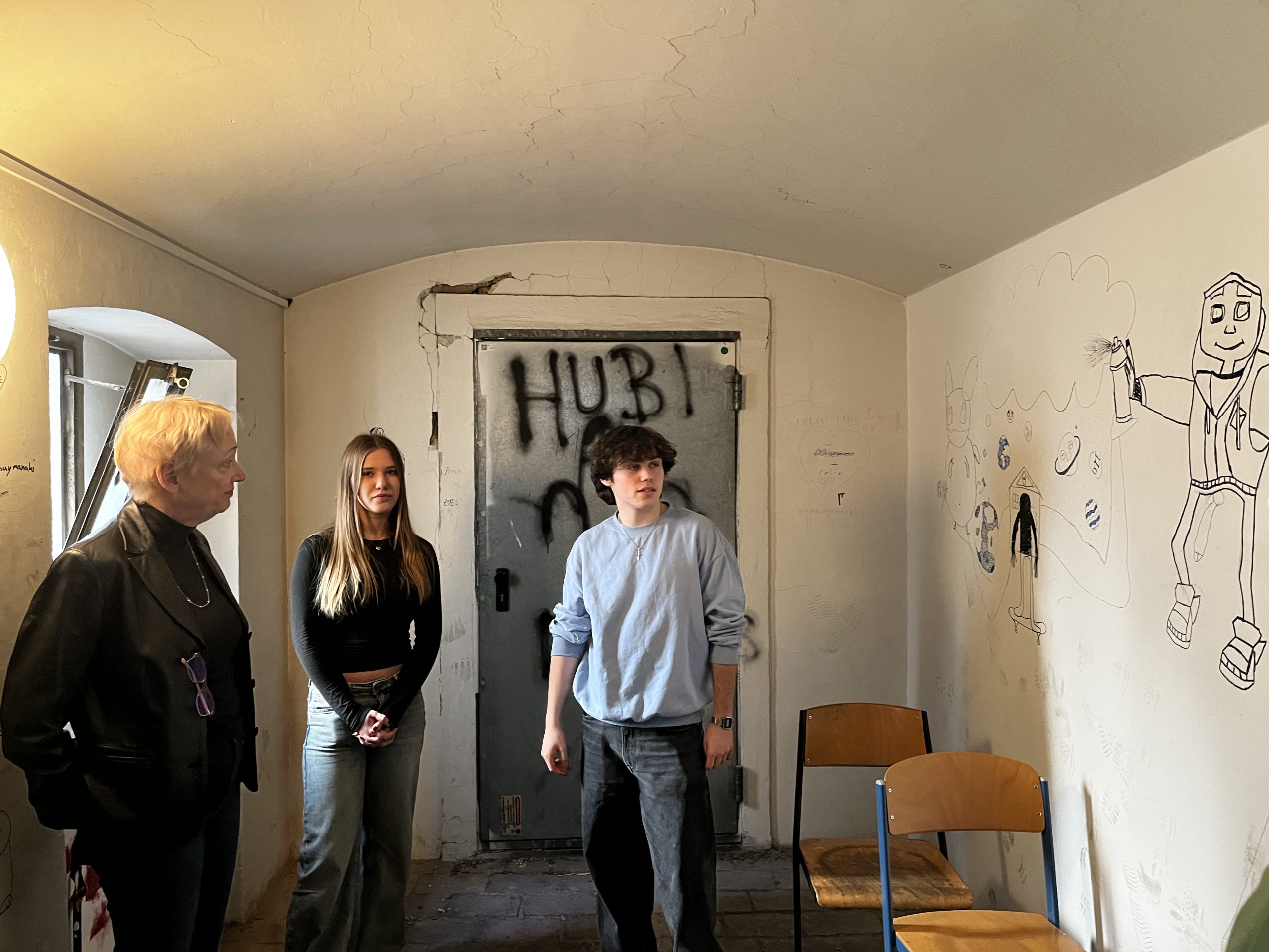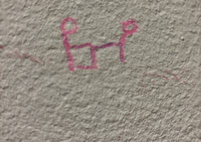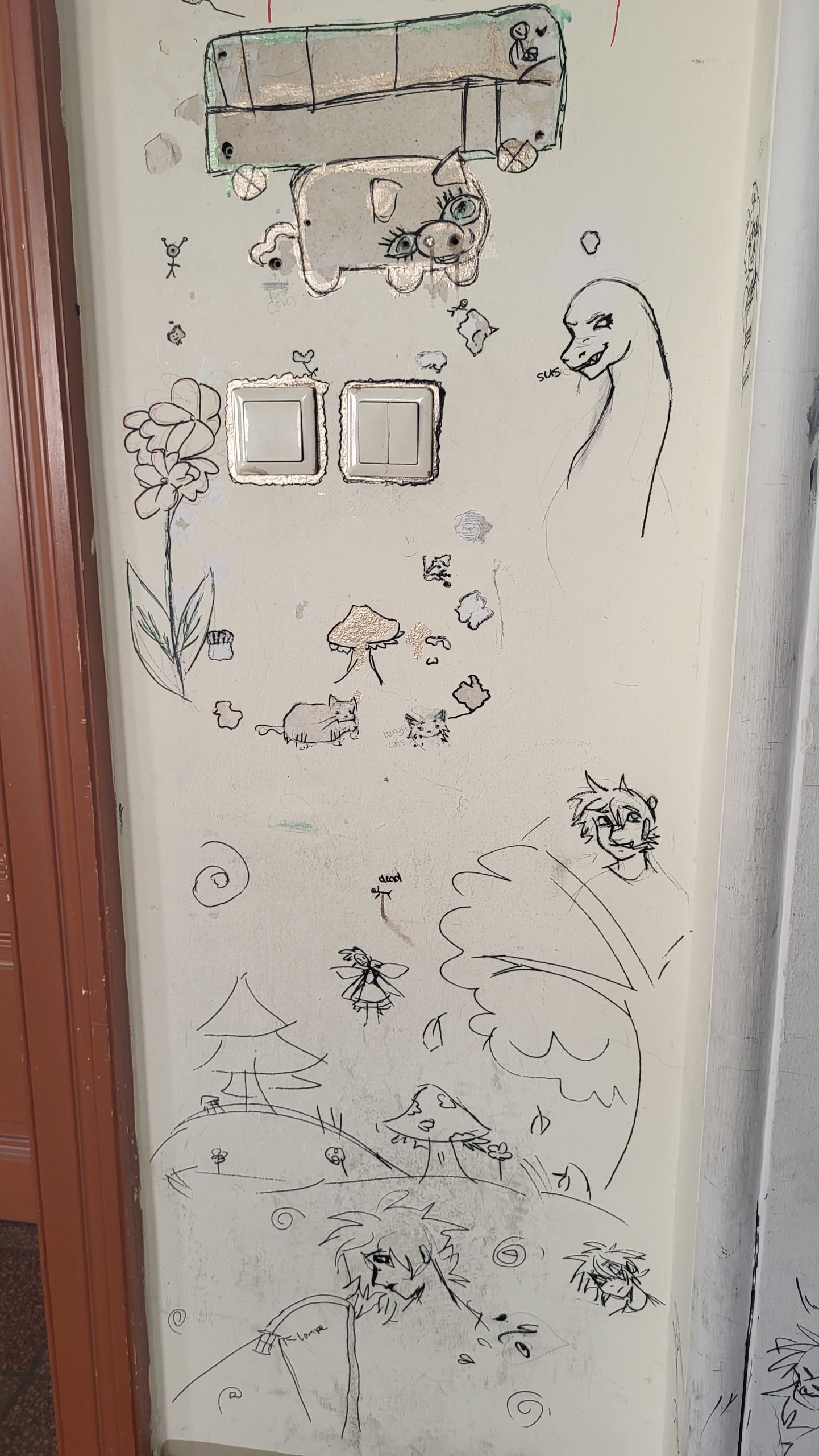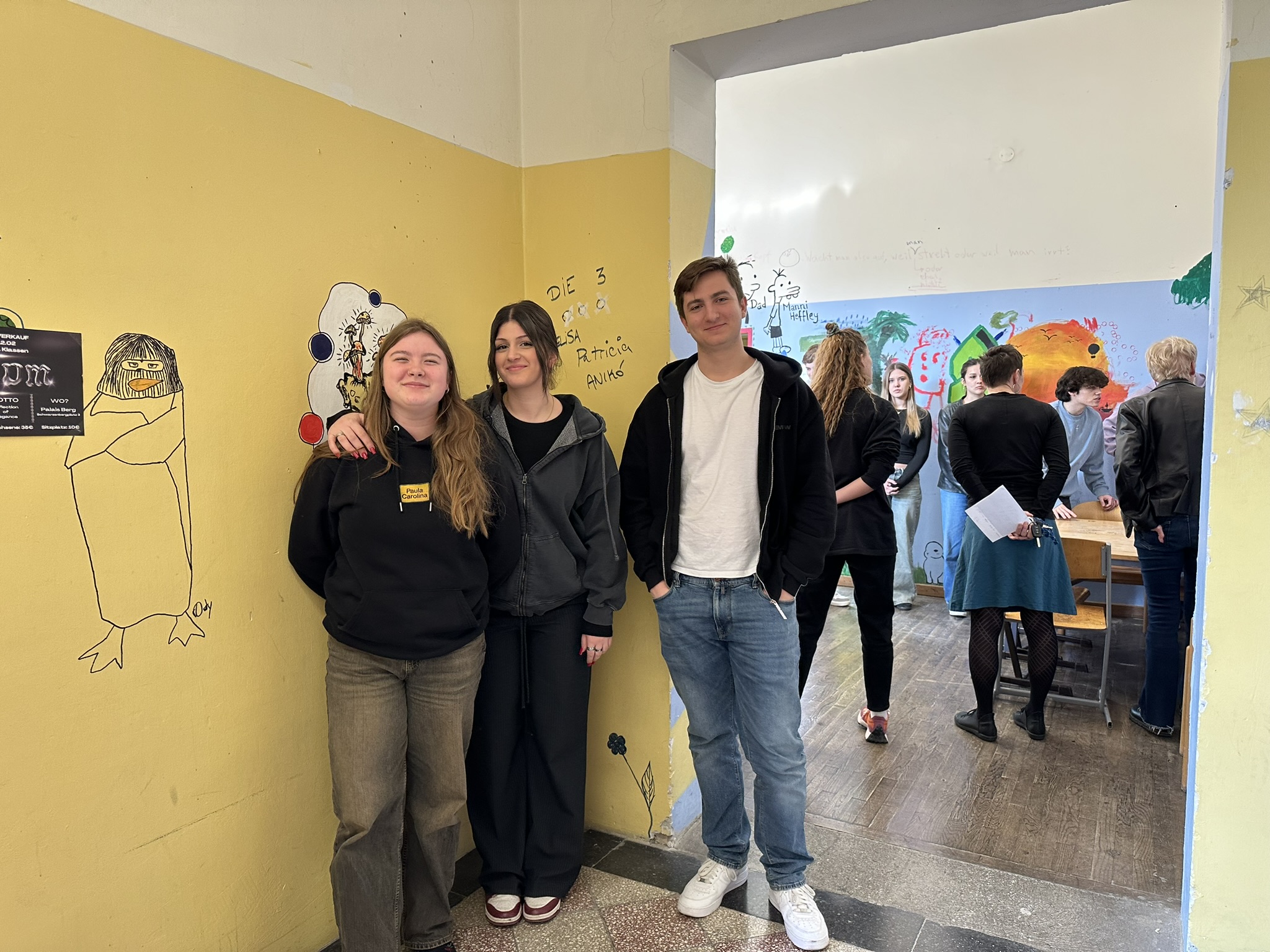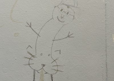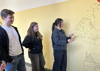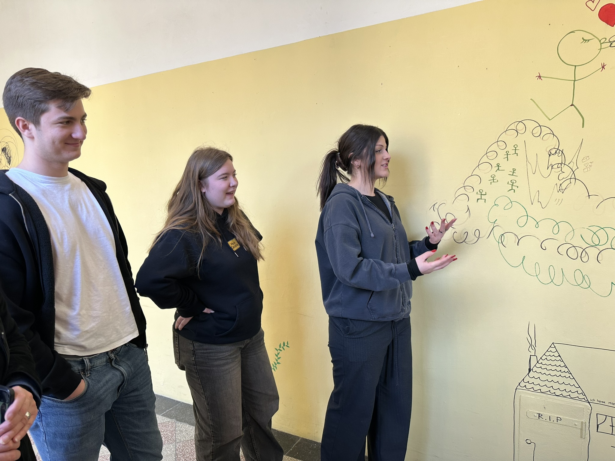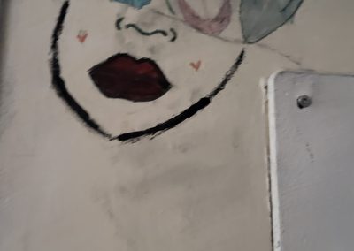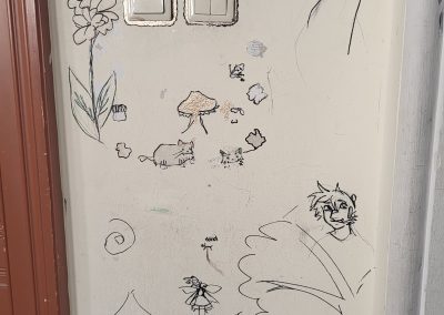 Das Gebäude war bei unserem Einzug vor drei Jahren in einem durch vorangegangene Nutzung anderer Schulen wenig einladendem Zustand. Da es nach dem Auszug unserer Schule generalsaniert wird, erfuhren die Wände in einem Projekt mit einer damaligen 3. Klasse erste Gestaltungen. Seither wurde fleißig weiter gezeichnet, gemalt und gekritzelt – einerseits im Rahmen des (Kunst-)Unterrichts, andererseits aber auch von einzelnen Schüler:innen, die zumeist anonym geblieben sind.
