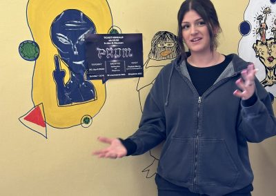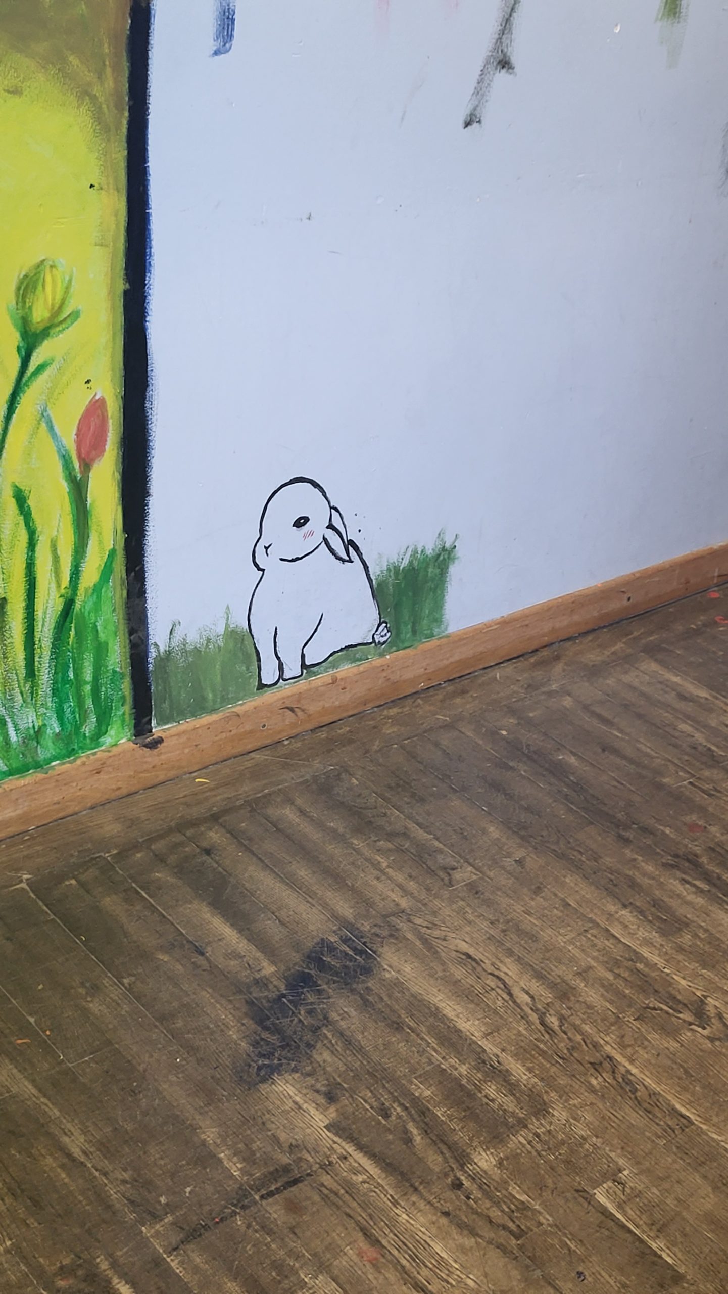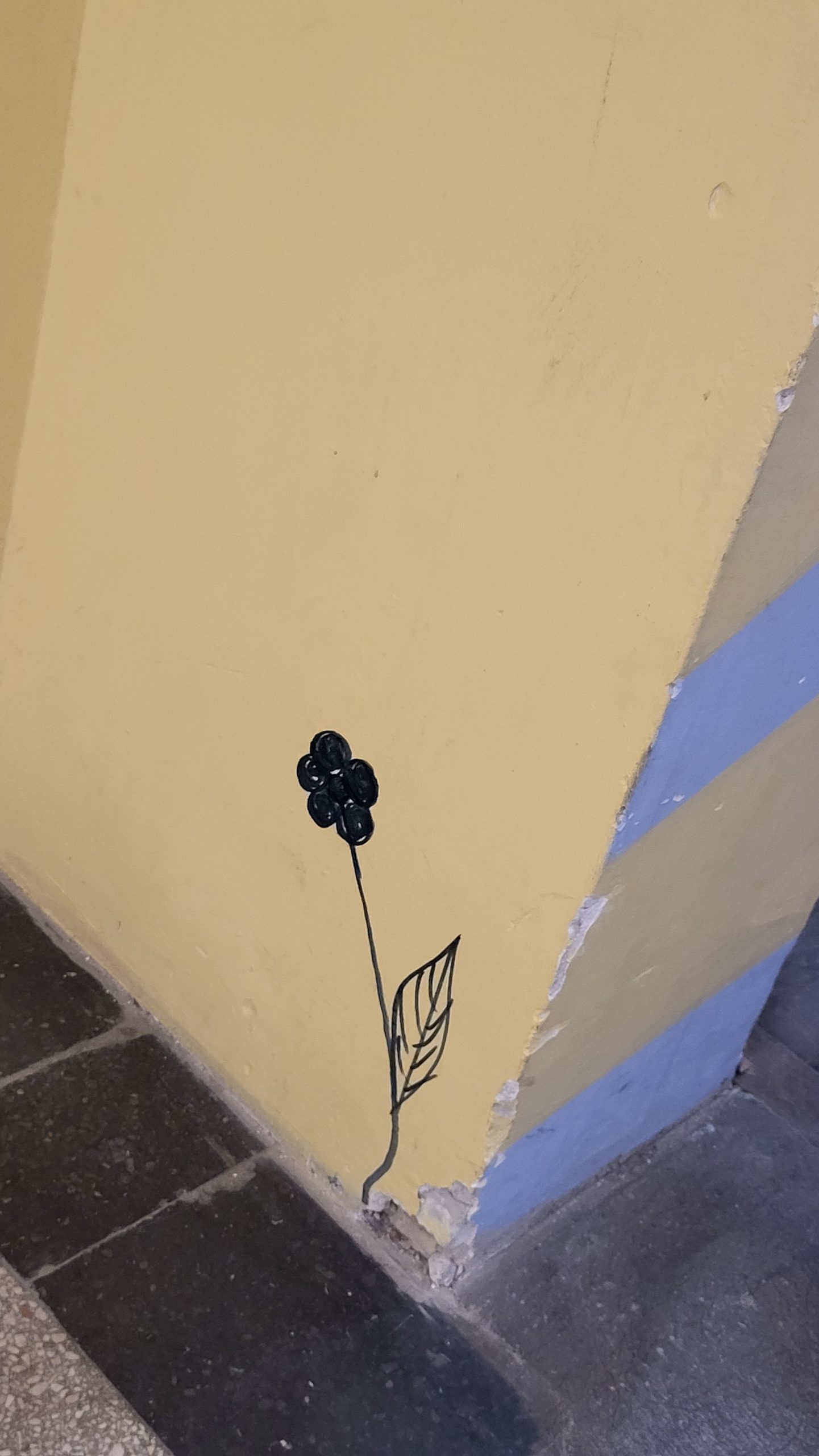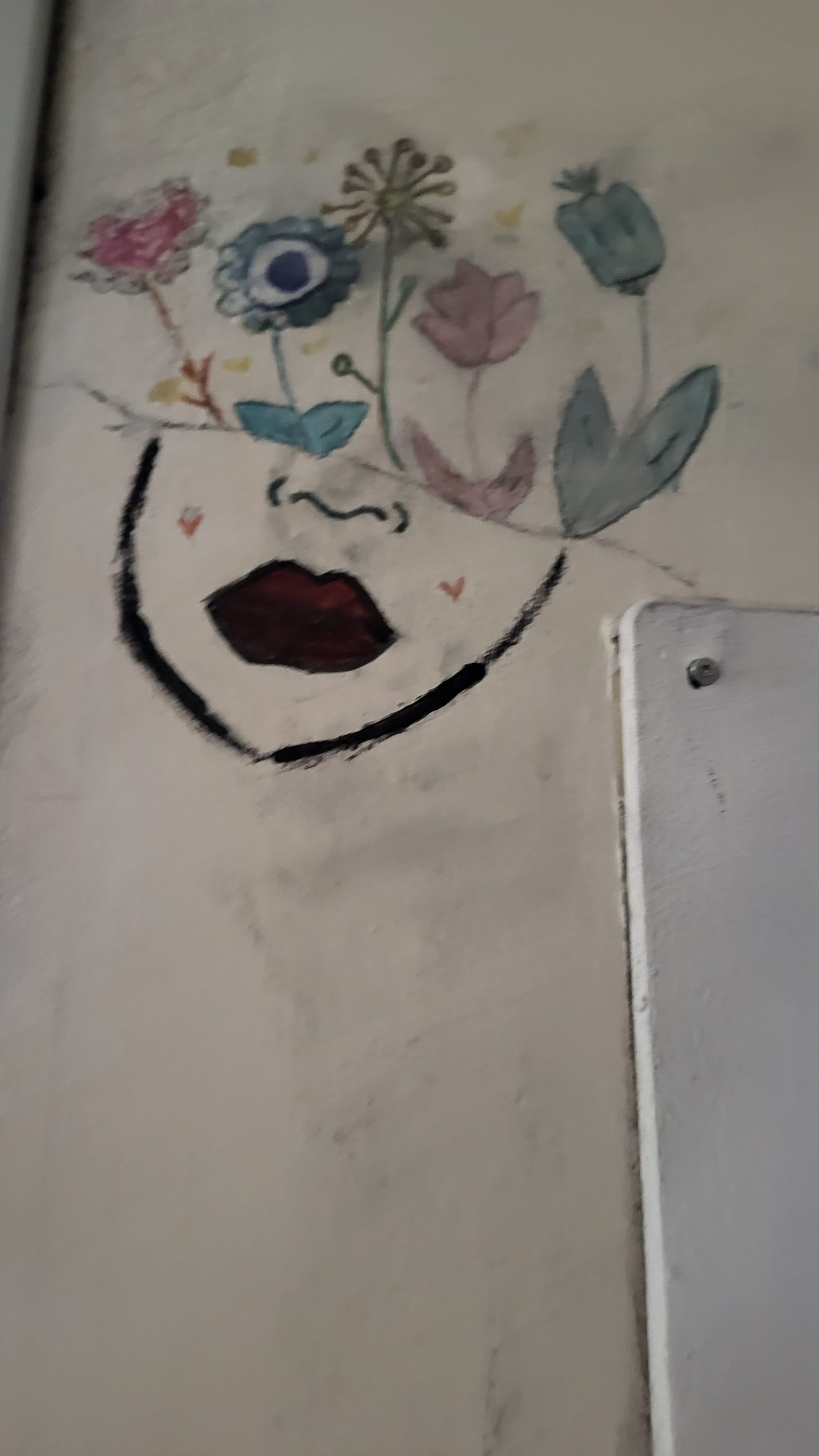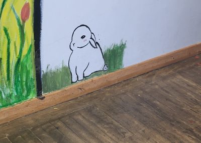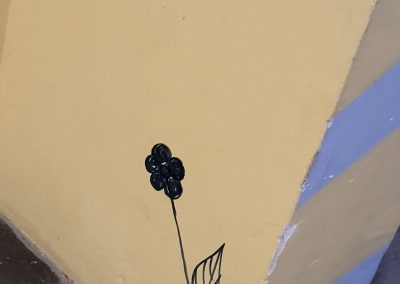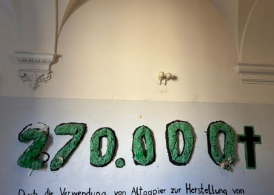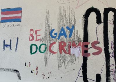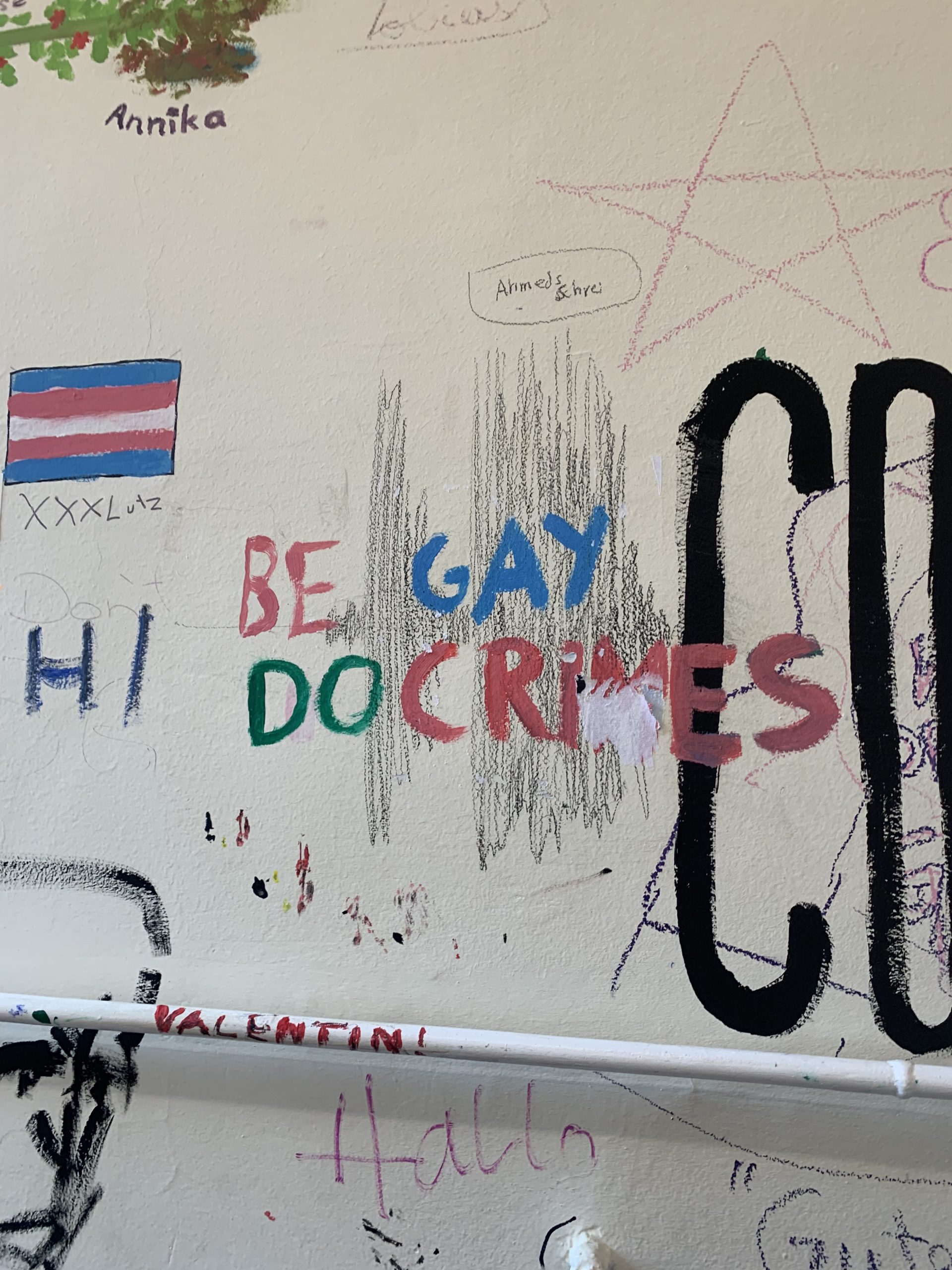 Das Gebäude war bei unserem Einzug vor drei Jahren in einem durch vorangegangene Nutzung anderer Schulen wenig einladendem Zustand. Da es nach dem Auszug unserer Schule generalsaniert wird, erfuhren die Wände in einem Projekt mit einer damaligen 3. Klasse erste Gestaltungen. Seither wurde fleißig weiter gezeichnet, gemalt und gekritzelt – einerseits im Rahmen des (Kunst-)Unterrichts, andererseits aber auch von einzelnen Schüler:innen, die zumeist anonym geblieben sind.