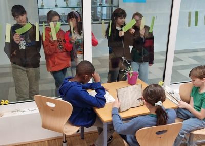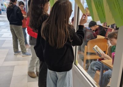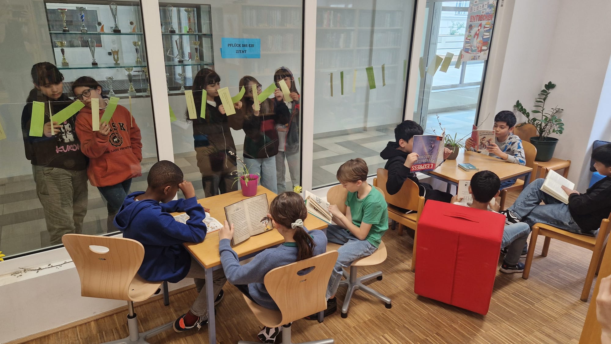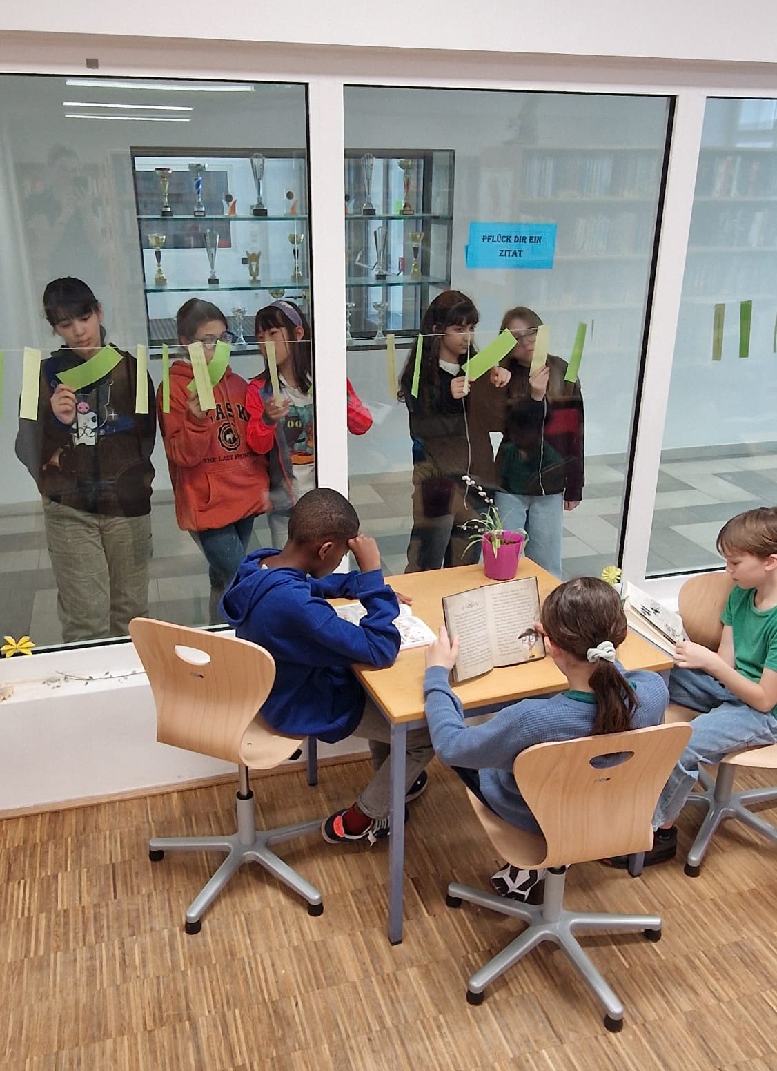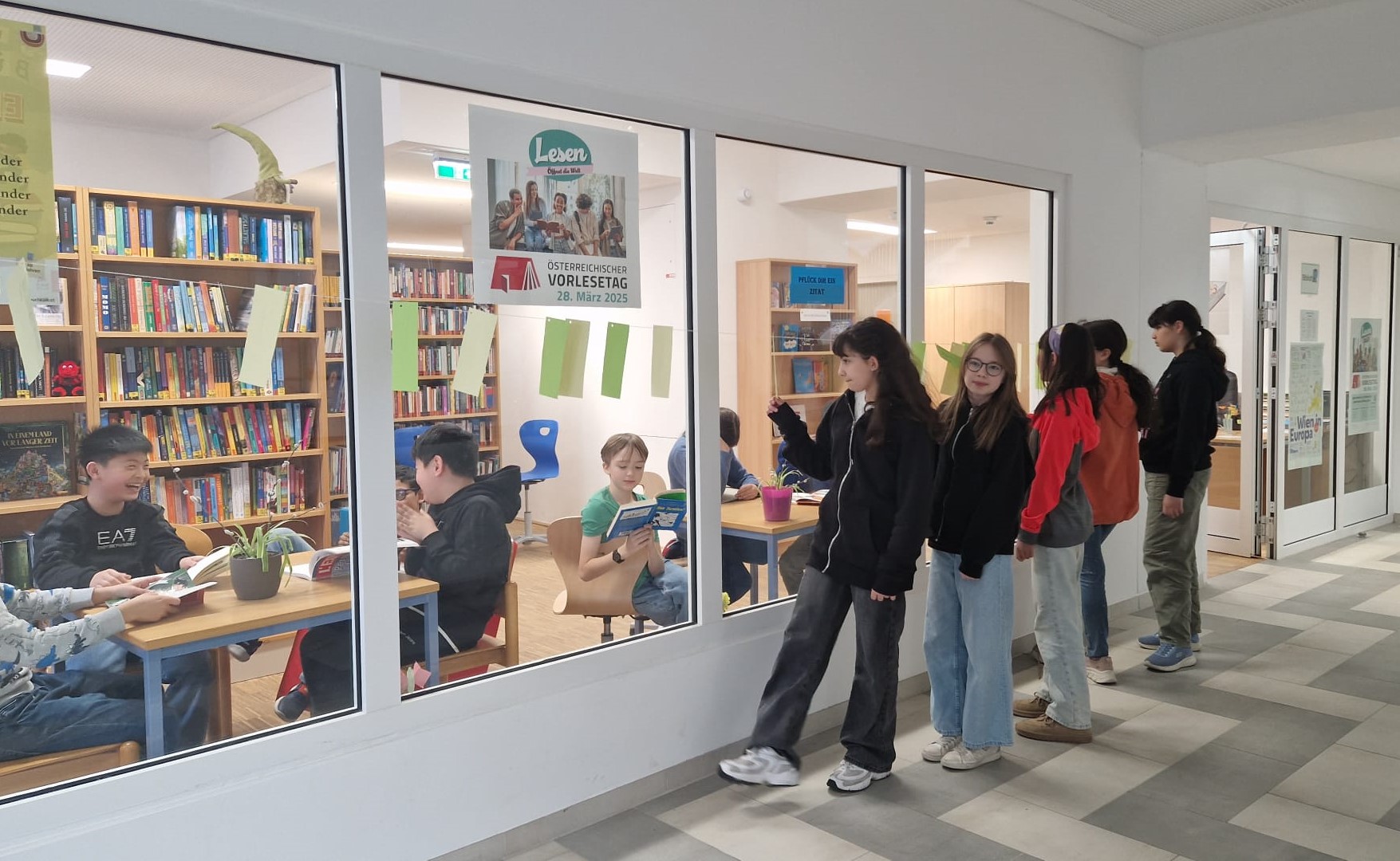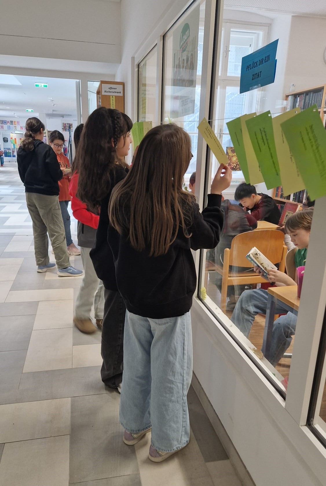 Anlässlich des österreichischen Vorlesetags am 28. März 2025 wurden Zitate wie dieses zum Thema „Lesen/Bücher“ an der Glasfront der Schulbibliothek zum „Pflücken“ aufgehängt.