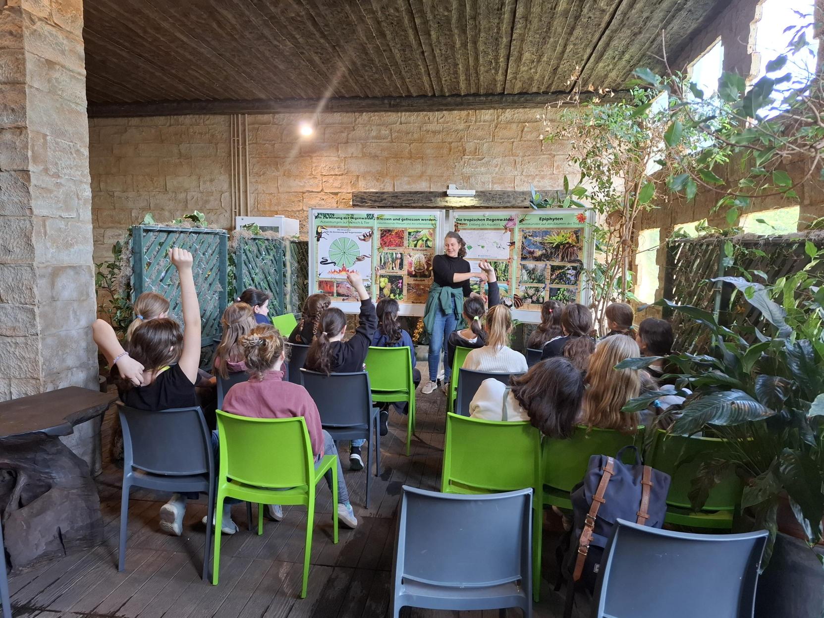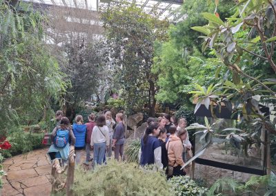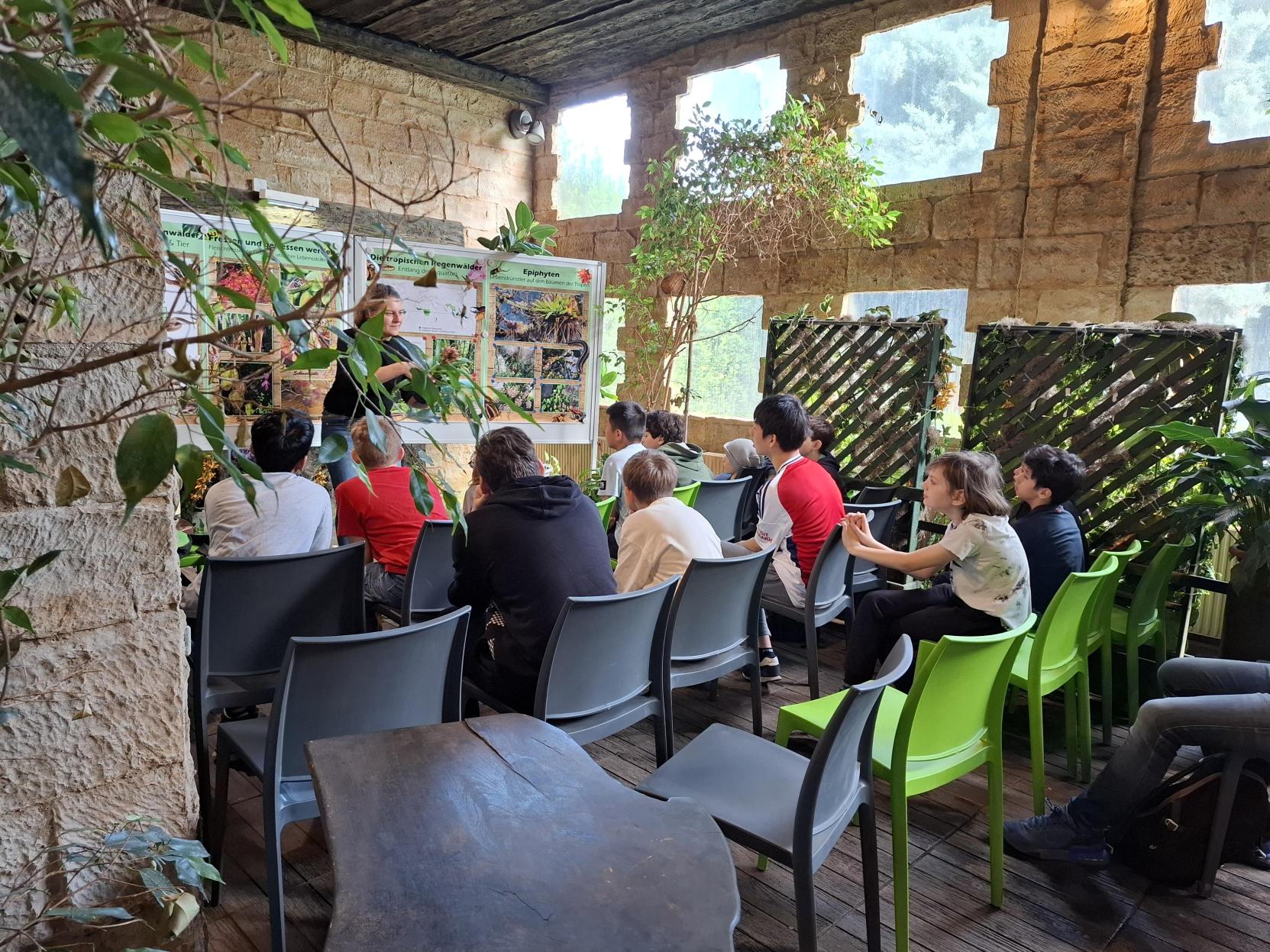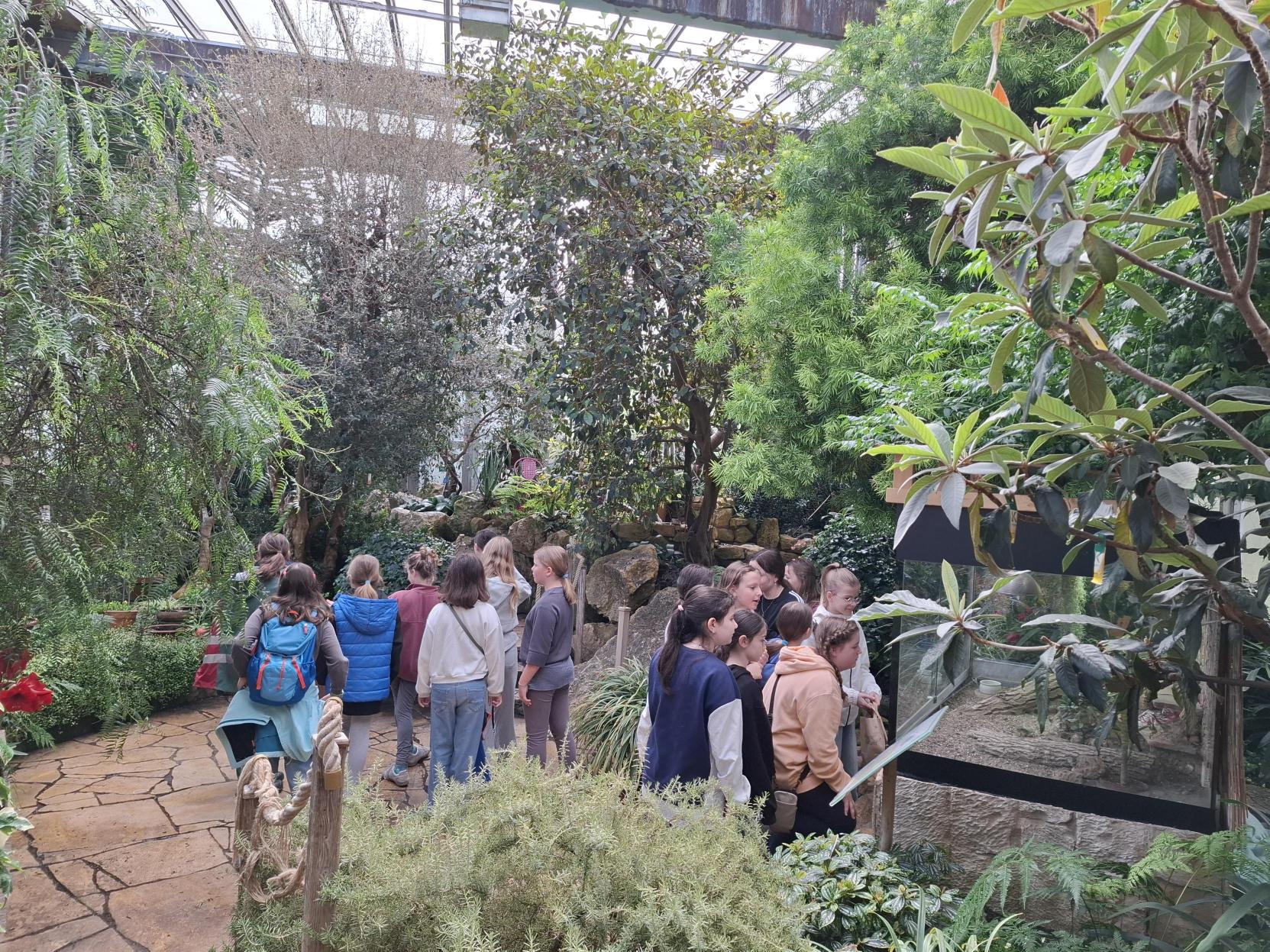 Der Weg führte zunächst durch das Palmenhaus entlang des Äquators und weiter in den tropischen Regenwald. Dort lernten die Kinder vielfältige Pflanzenarten kennen – von solchen, die in engen Lebensgemeinschaften wachsen, bis hin zu Pflanzen, die im ständigen Überlebenskampf mit Klima, Tieren oder anderen Pflanzen stehen.