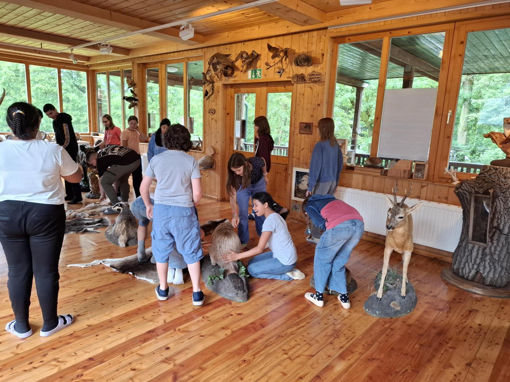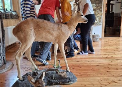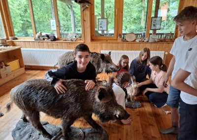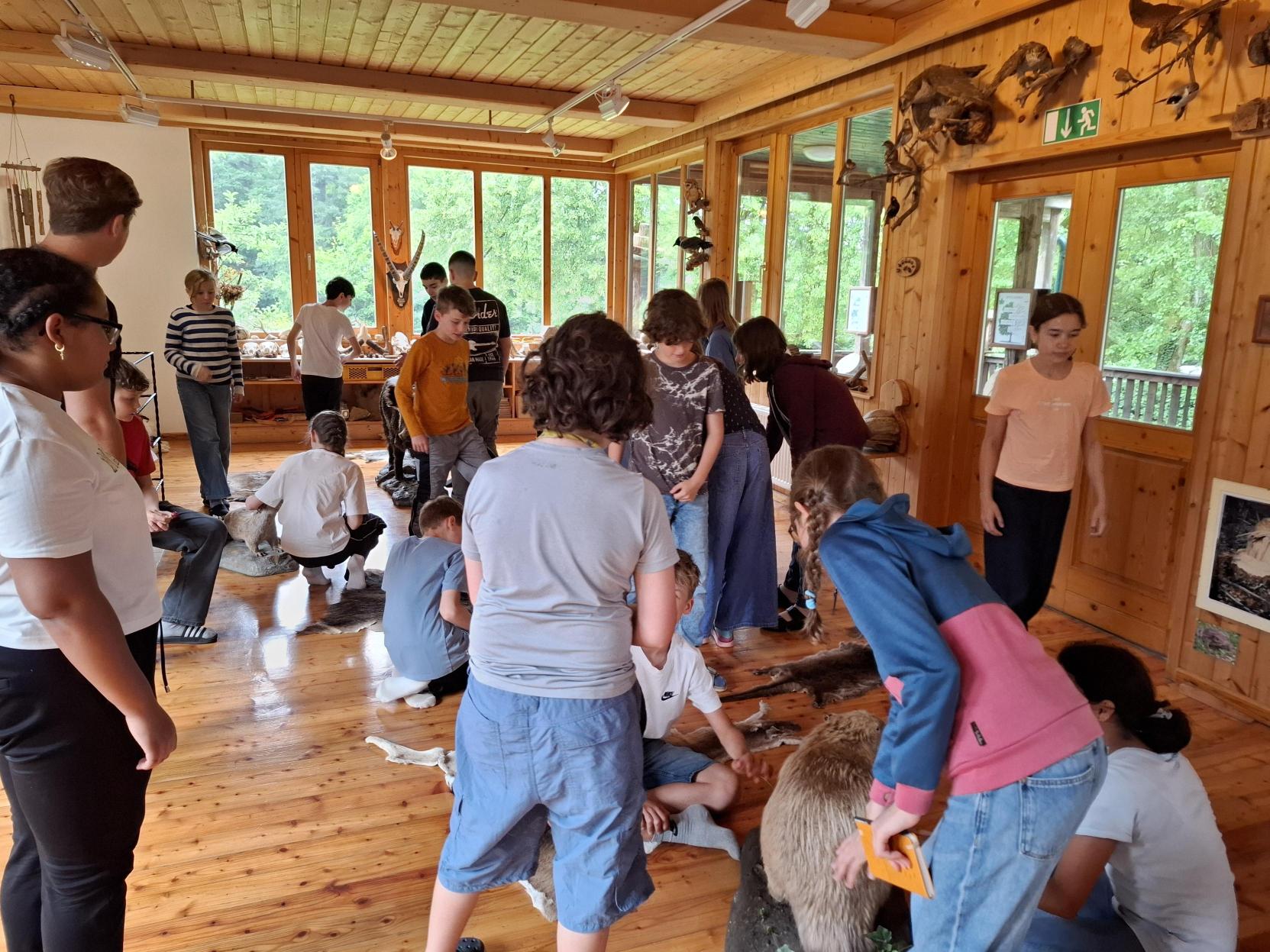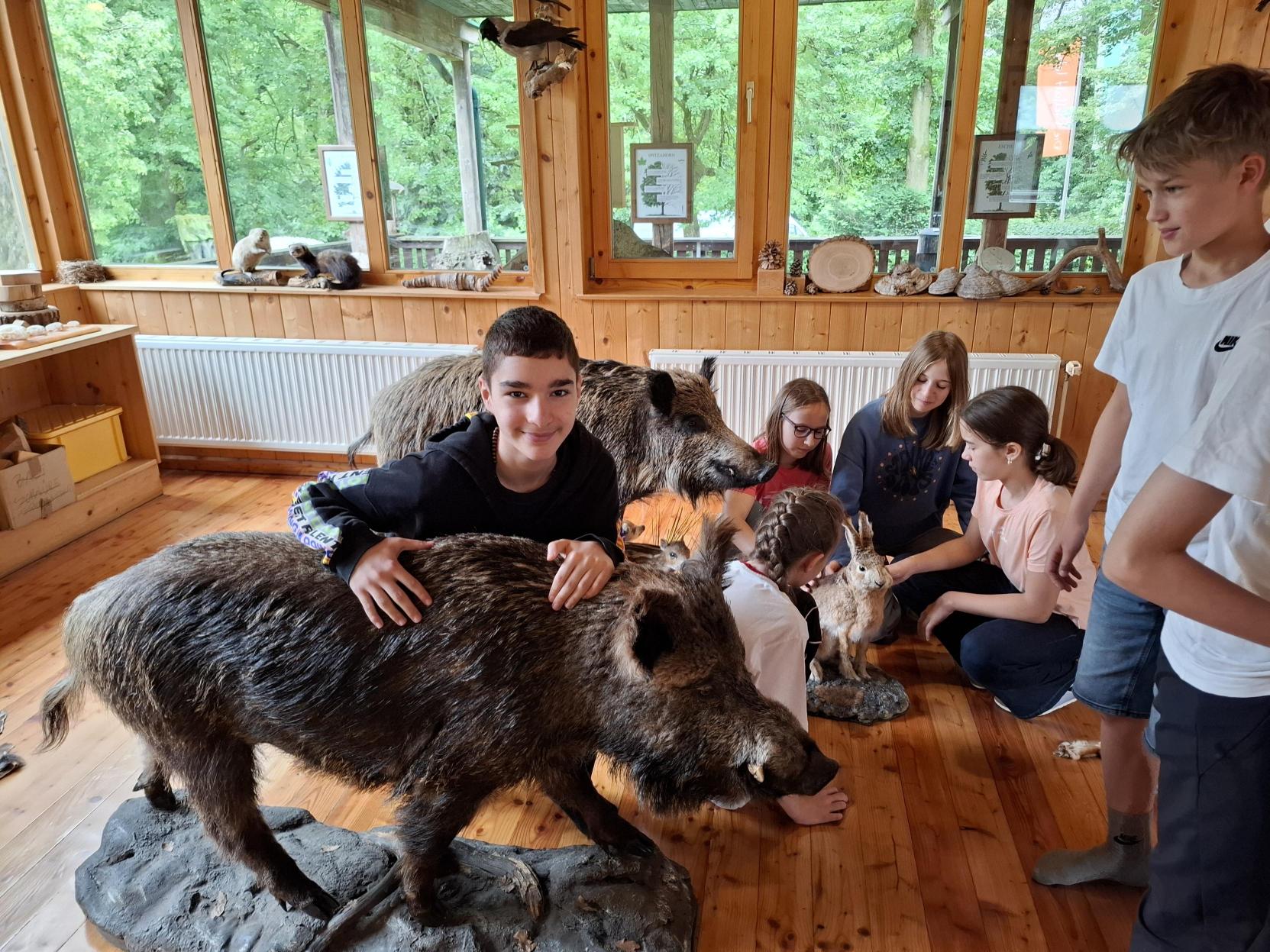 In der Waldschule erwarteten die Kinder viele interessante und „angreifbare“ Exponate wie Stammscheiben, Geweihe und präparierte Wildtiere, die sogar gestreichelt werden durften. Durch das direkte Erleben und Anfassen konnten die Kinder viel über den Wald und seine Bewohner lernen.
