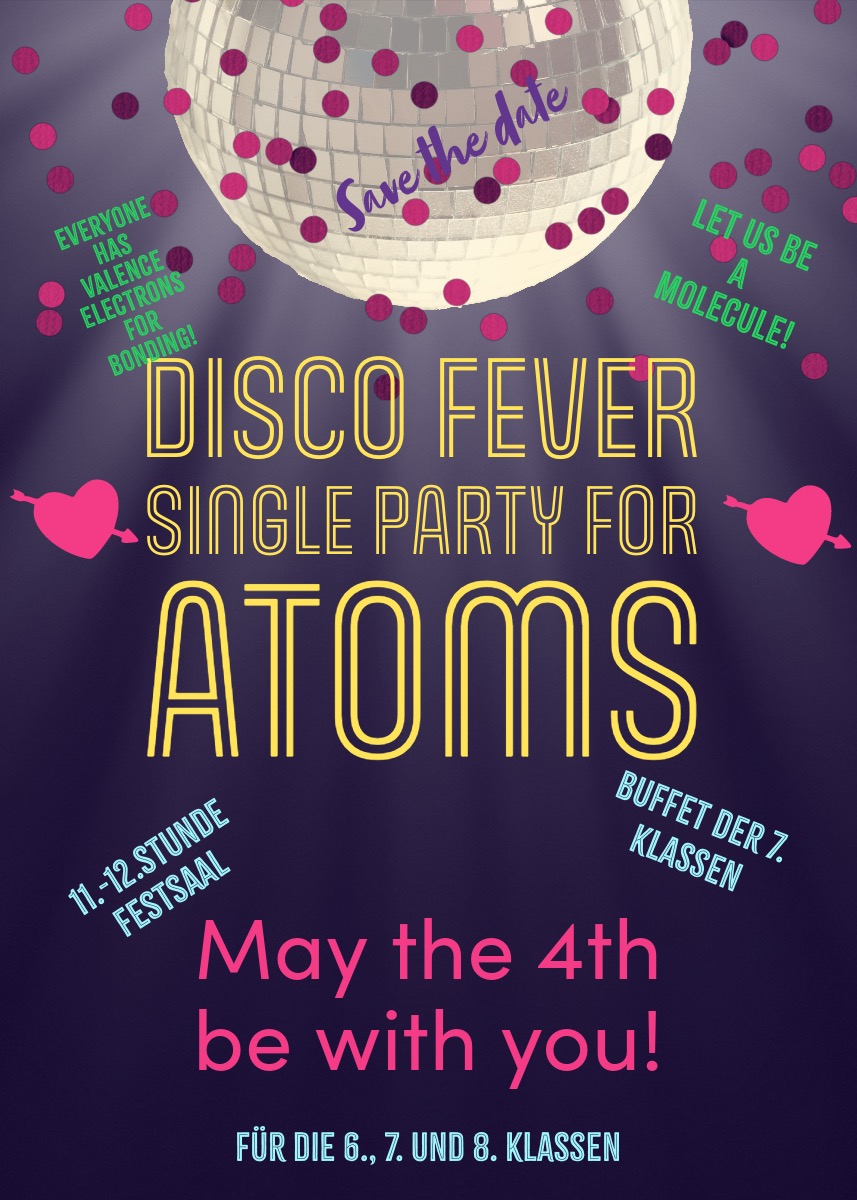 Am 04.05.23 fand für die 6. bis 8. Klassen in der 11-12. Stunde im Festsaal eine Single Party für Atome statt. Die Schüler:innen der 6A und 7BG gestalteten dazu im Vorfeld Steckbriefe für die verschiedenen Elemente in einer Art Tinderprofil (mit welchem anderen Element werden gern Bindungen eingegangen, mit wem…