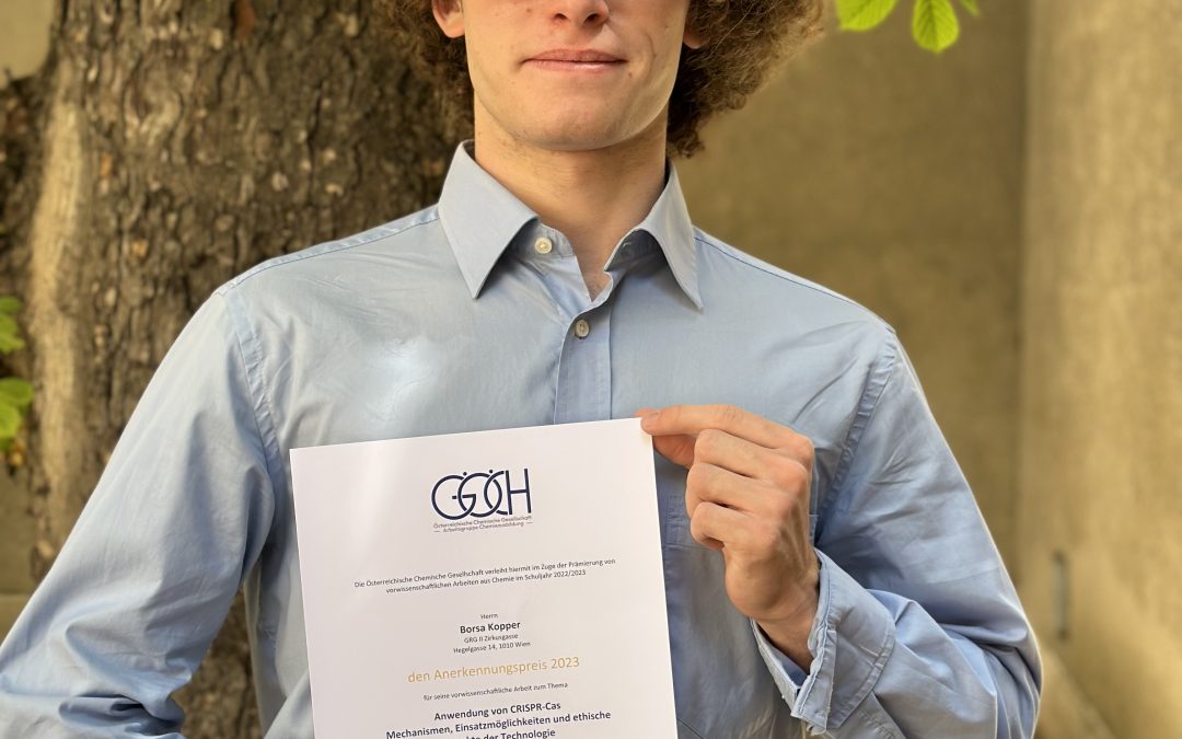 Borsa Kopper, Schüler der 8A im Schuljahr 2022/23, hat für seine großartige VWA mit dem Thema "Anwendung von CRISPR Cas: Mechanismen, Einsatzmöglichkeiten und ethische Aspekte der Technologie" den Anerkennungspreis 2023 des GÖCH, Österreichische chemische Gesellschaft, bekommen. Borsa beschreibt darin die Funktion und die Einsatzmöglichkeiten von CRISPR Cas in der Gentechnik…